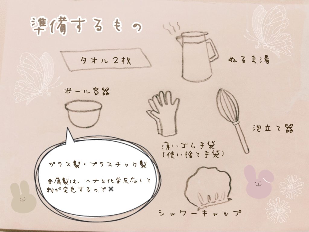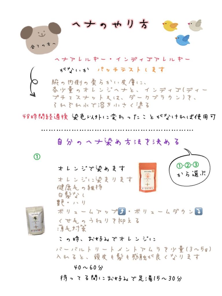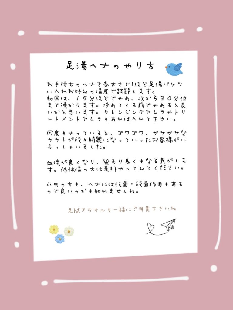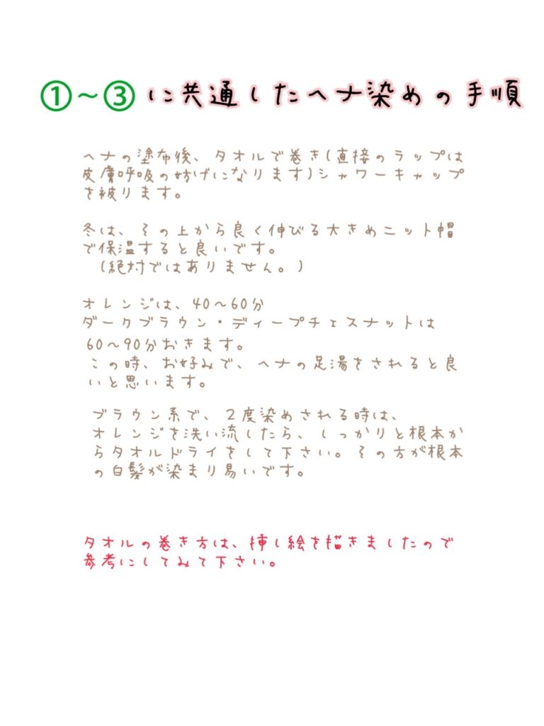 ヘナの使い方ガイド 2024 5/05 ヘナ 11/05/202305/05/2024 目次ヘナのやり方 ヘナの分量と目安 準備する物 染め方(イラスト) タオルの巻き方(イラスト) 足湯ヘナ ヘナの効能 その他お伝えしたい事 “ヘナ染め後の2〜3日はお湯洗いでお過ごし下さい” ヘナ アムラタブレットの摂取するタイミングと量 関連記事関連する記事はまだ見つかりませんでした。